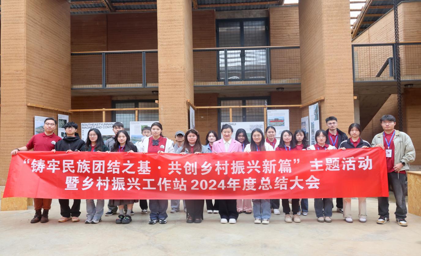 在建筑楼中庭举办“铸牢民族团结之基·共创乡村振兴新篇”主题活动暨乡村振兴工作站2024—2025学年总结大会。学校党委宣传部、乡村振兴研究院、马克思主义学院相关负责人及师生100余人参加了活动。