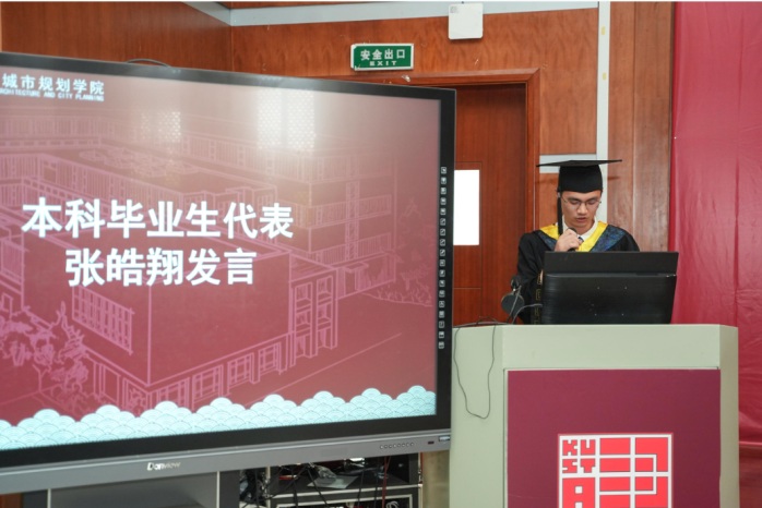 本科生代表张皓翔与研究生代表邓景文分别上台发言,细数求学旅程中的苦与乐。邓景文动情讲述:“在图纸与模型之间,我们丈量空间、塑造理想,青春的热望在熬夜灯光中燃烧,也在田野调研中沉淀。正是老师与同窗的陪伴,让我们度过了这段令人难忘的旅程。