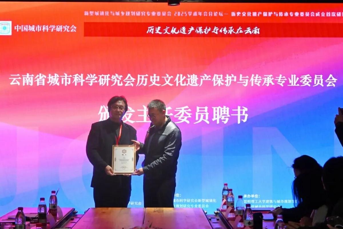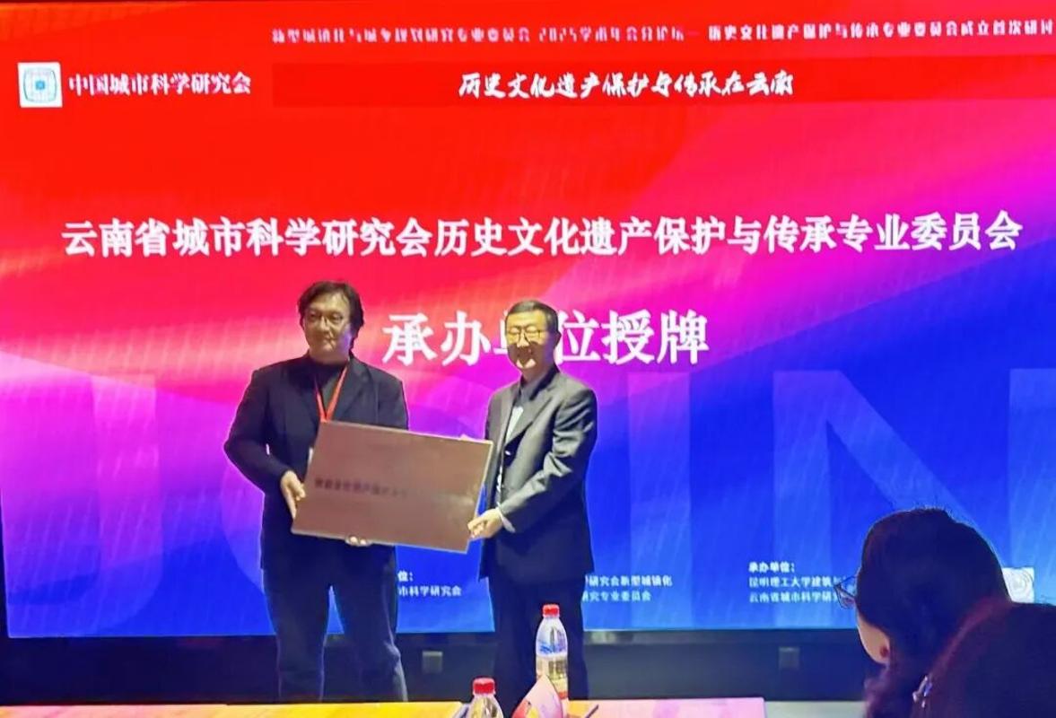 为专委会承办单位。在授牌与聘任环节,云南省城市科学研究会原理事长刘学向承办单位授牌,理事长张扬向专委会主任委员杨毅院长颁发聘书。